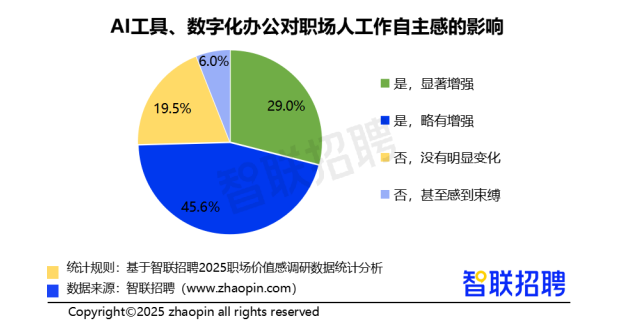 数字化工具的普及正深刻重塑职场人的工作自主感,成为衡量“好工作”的重要维度。调研显示,29%的职场人表示使用AI工具与数字化办公后工作自主感“显著增强”,45.6%表示“略有增强”,这种能力强化具体体现在任务安排、流程推进与决策参与中的主动权扩大。AI赋能更健康、更高效的职场生态的作用正逐步显现——个体胜任力与主体性不仅得到了提升,也推动人机协作迈向更高效、更紧密的共生关系。